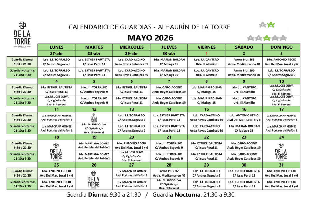 Si necesita atención farmacéutica fuera del horario habitual, puede acudir a la farmacia asignada según el cartel oficial de guardias. A continuación le mostramos los horarios correspondientes al periodo vigente, disponibles en formato visual para una consulta rápida y sencilla.